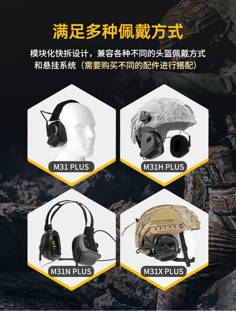 EARMOR 耳魔 M31 PLUS是专为日常训练设计的电子拾音降噪听力保护耳机,可抑制高噪音并增强环境音,提高对语音、动作、射击等感知。模块化设计适应不同悬挂系统,配备贴合面部的密封凝胶耳垫,有效隔绝声音、防汗,适合长时间佩戴。M31 PLUS 支持 3.5毫米 AUX 音频连接线。通信线符合军规标准,可通过 EARMOR® 耳魔 M51/52 PTT(或者 NATO 标准的军规 PTT)连接 PTT。